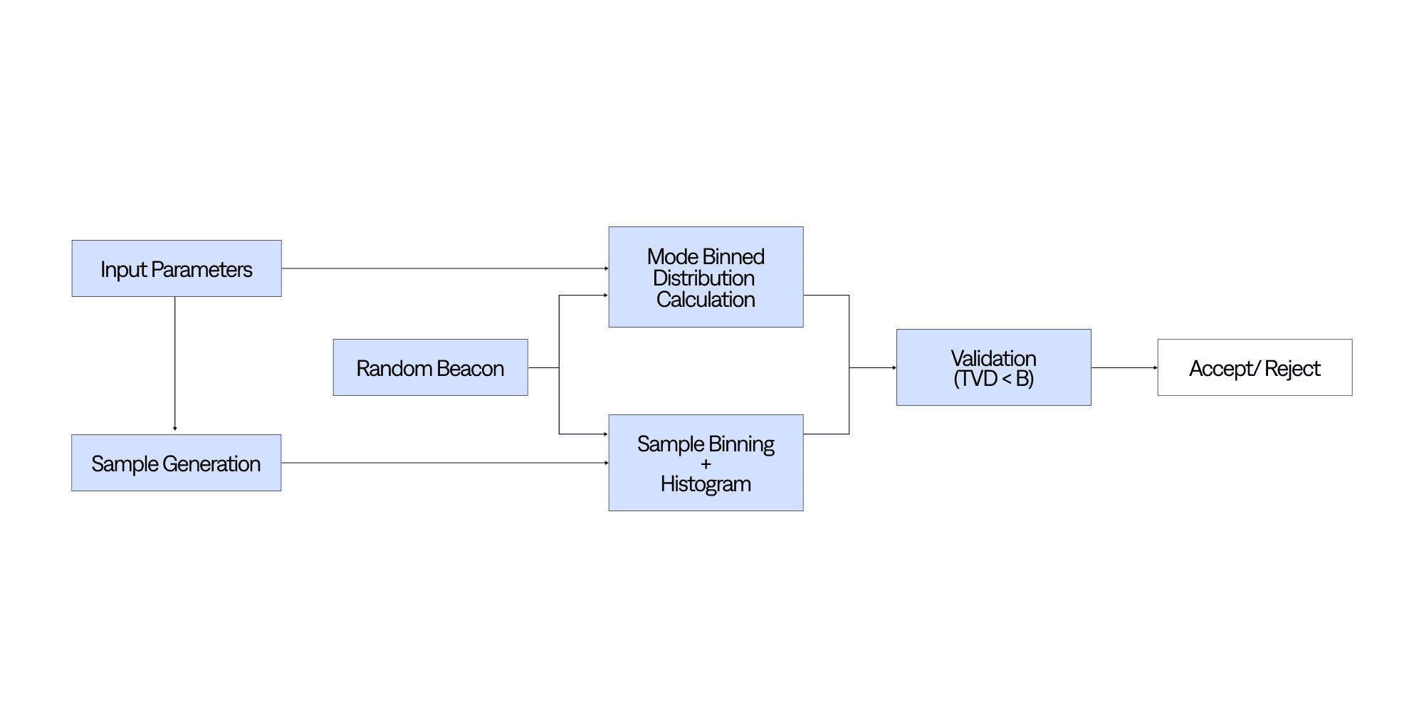 Beyond efficiency, we have also enhanced the security of the verification protocol in the latest iteration of our work. Extensive numerical simulations confirm that classical miners cannot spoof valid samples without prior knowledge of the binning scheme. This added security is achieved by introducing randomization in the binning process, such as using random beacons or quantum random number generators (QRNG) to generate binning schemes after sample commitments. By ensuring that miners cannot predict or manipulate the binning strategy, the protocol maintains its integrity and fairness.