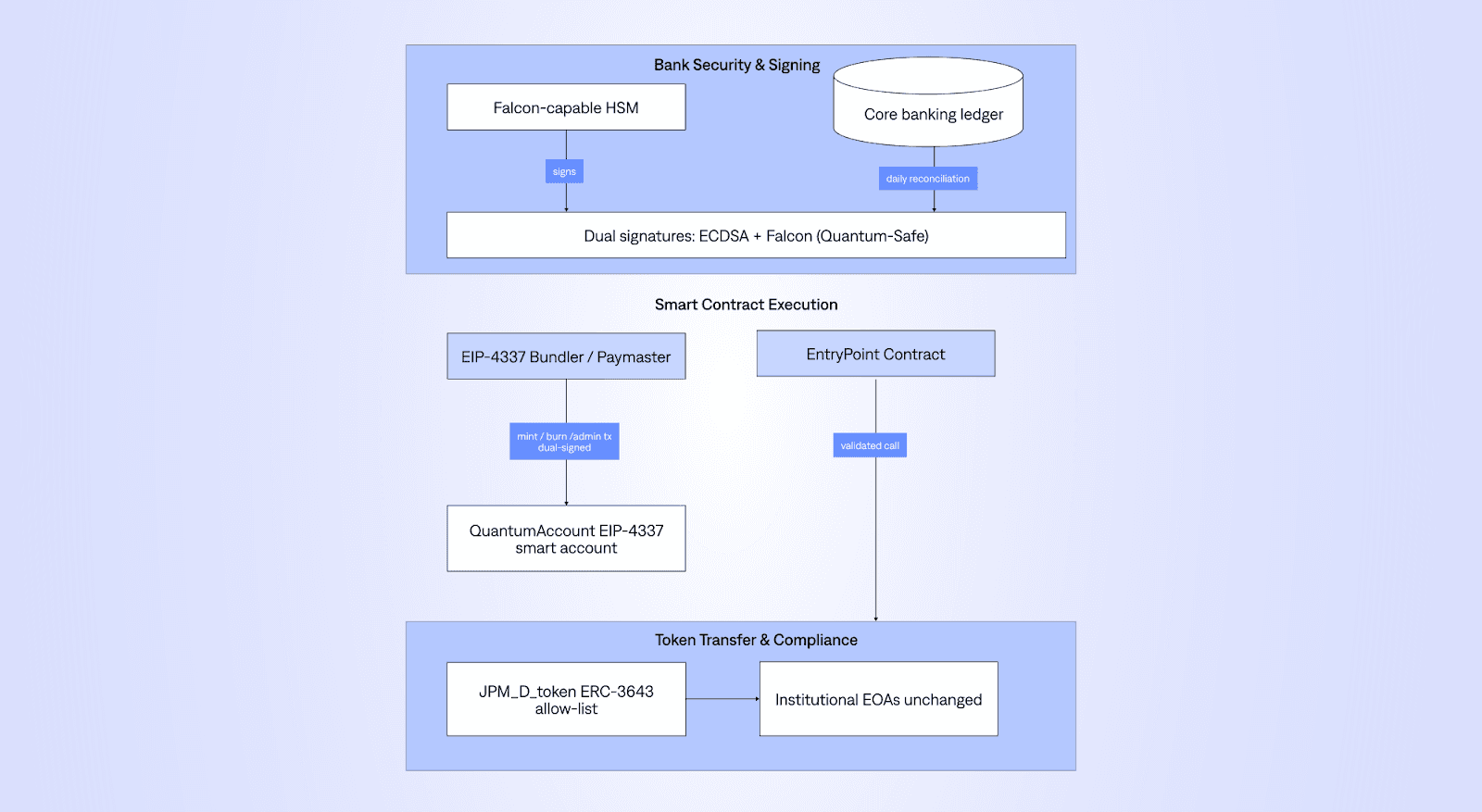 This model allows JPMorgan—and by extension, any regulated stablecoin issuer—to integrate quantum-safe protections today, without rewriting token logic, disrupting allow-lists, or requiring end-users to adopt post-quantum keys.